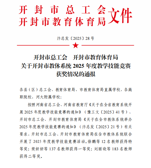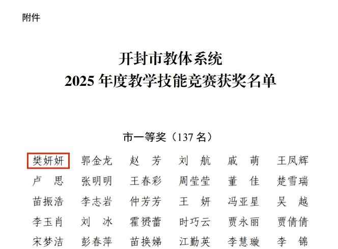 近日,开封市总工会、开封市教育体育局联合下发《关于开封市教体系统2025年度教学技能竞赛获奖情况的通报》(汴总发〔2025〕28号),公布了本年度教学技能竞赛的获奖名单。古天乐太阳集团网址樊妍妍老师在竞赛中表现优异,荣获市级一等奖。